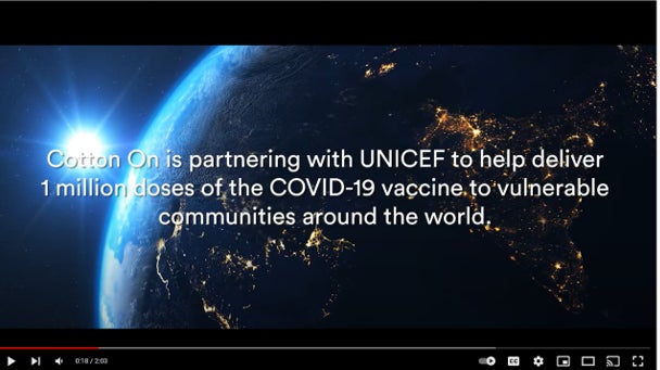 The Cotton On Group was the first global retailer dedicating an in-store and online campaign to support UNICEF to fund the equitable delivery and administration of 1 million doses of COVID-19 vaccines.